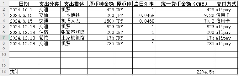 实际效果:2024 年去日本旅行的表格中,“交通” 分类下有 “东京地铁单次 200 日元(约 9.36 元 CNY)”“机场大巴 1500 日元(约 70.2 元 CNY)” 等记录,2024 年再去日本时,调出历史表格,只需更新 “当日汇率”,就能快速估算本次交通预算(如按最新汇率 0.053 计算,地铁单次约 10.6 元),无需重新查询当地交通费用,大幅节省预算规划时间。